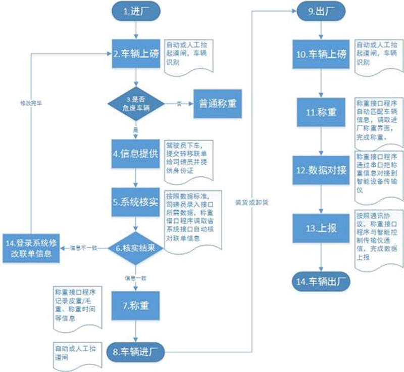 稱(chēng)重流程分為進(jìn)廠(chǎng)稱(chēng)重與出廠(chǎng)稱(chēng)重兩個(gè)環(huán)節,產(chǎn)廢企業(yè)進(jìn)廠(chǎng)秤皮重,出廠(chǎng)秤毛重,經(jīng)營(yíng)企業(yè)相反。